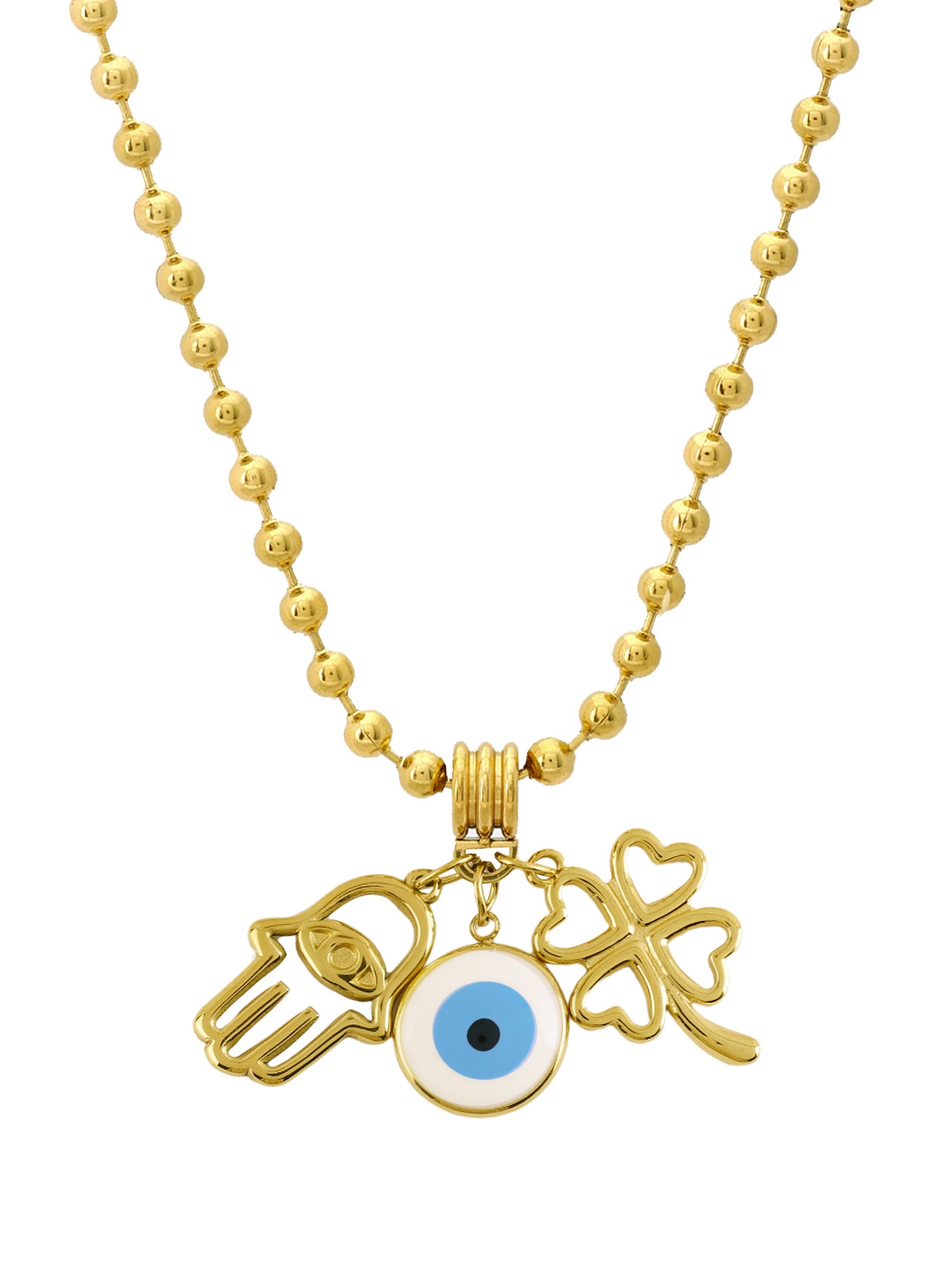 This Lucky Charm Necklace combines the power of the Evil Eye, Hamsa Hand, and Four-Leaf Clover for protection, luck, and positivity.