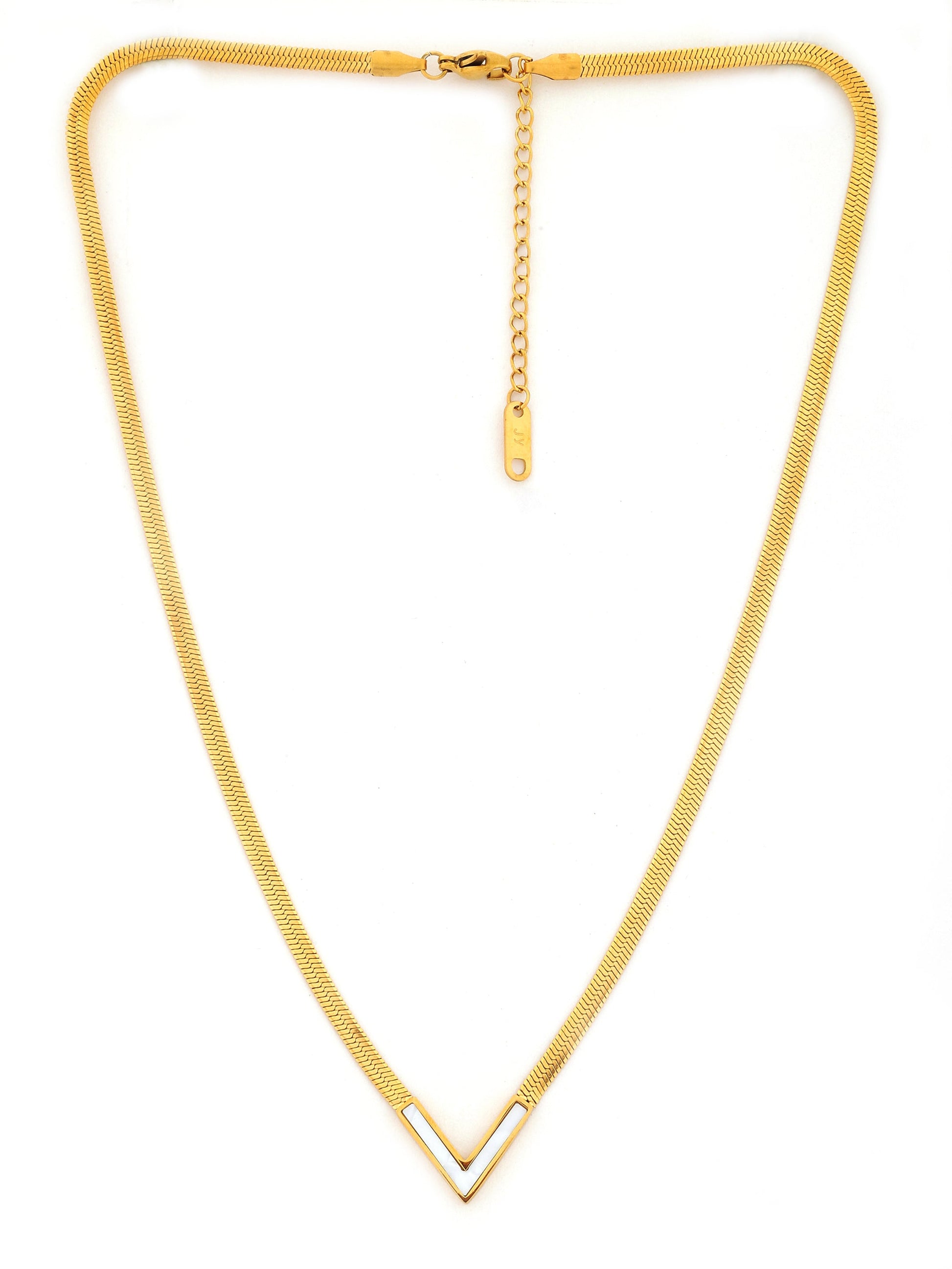 Add a touch of elegance with this minimalist V-shaped pendant necklace, crafted in gold-tone with a sleek enamel inlay. Its sharp chevron design enhances the neckline, making it perfect for layering or wearing solo. A modern classic that transitions effortlessly from day to evening style.